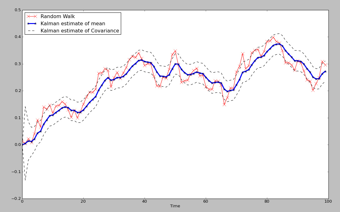 Basically, we start out estimating our guess of the the average and covariance of the hidden series based upon measurements of the observable series, which in this case are simply the normal parameters N(mean, std) used to generate the random walk. From there, the linear matrix equations are used to estimate the values of cov x and x, using linear matrix operations. The key is that once an estimate is made, the value of the covariance of x is then checked against the actual observable time series value, y, and a parameter called K is adjusted to update the prior estimates. Each time K is updated, the value of the estimate of x is updated via: